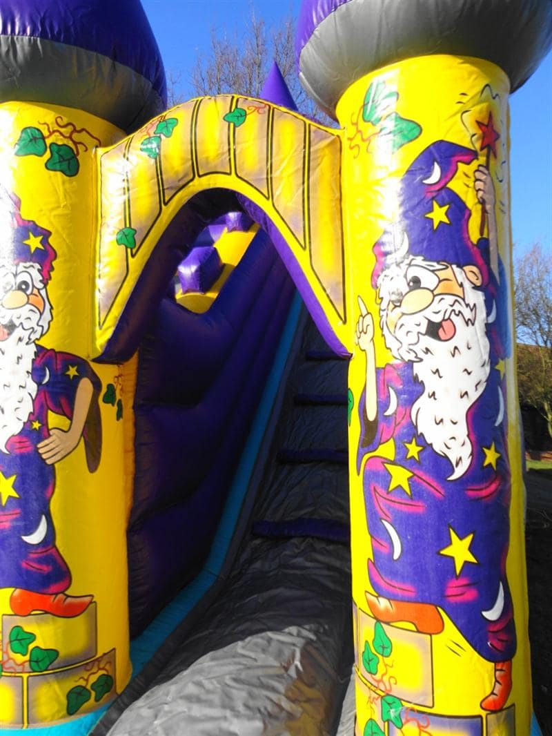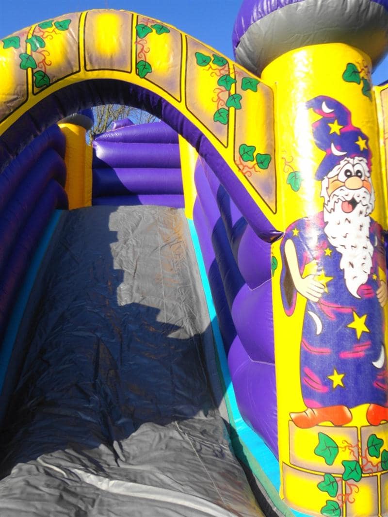 Exquisite Giant Slide with a Ten Foot Platform and steep pitch for a fast ride! Has a Foam ladder, which is kinder to your feet and a cartoon Wizard Theme.